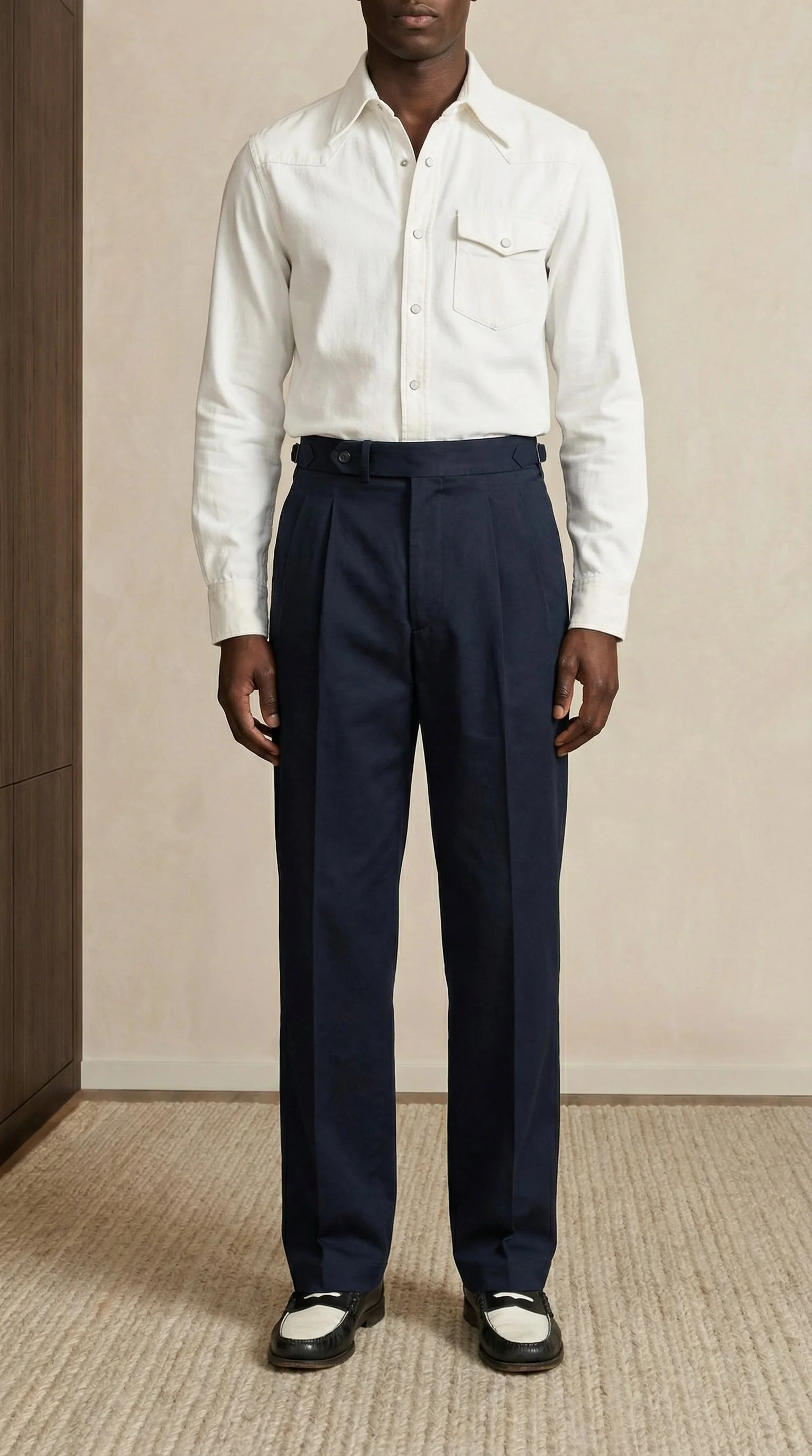 Pantalon marine en laine à ajusteurs