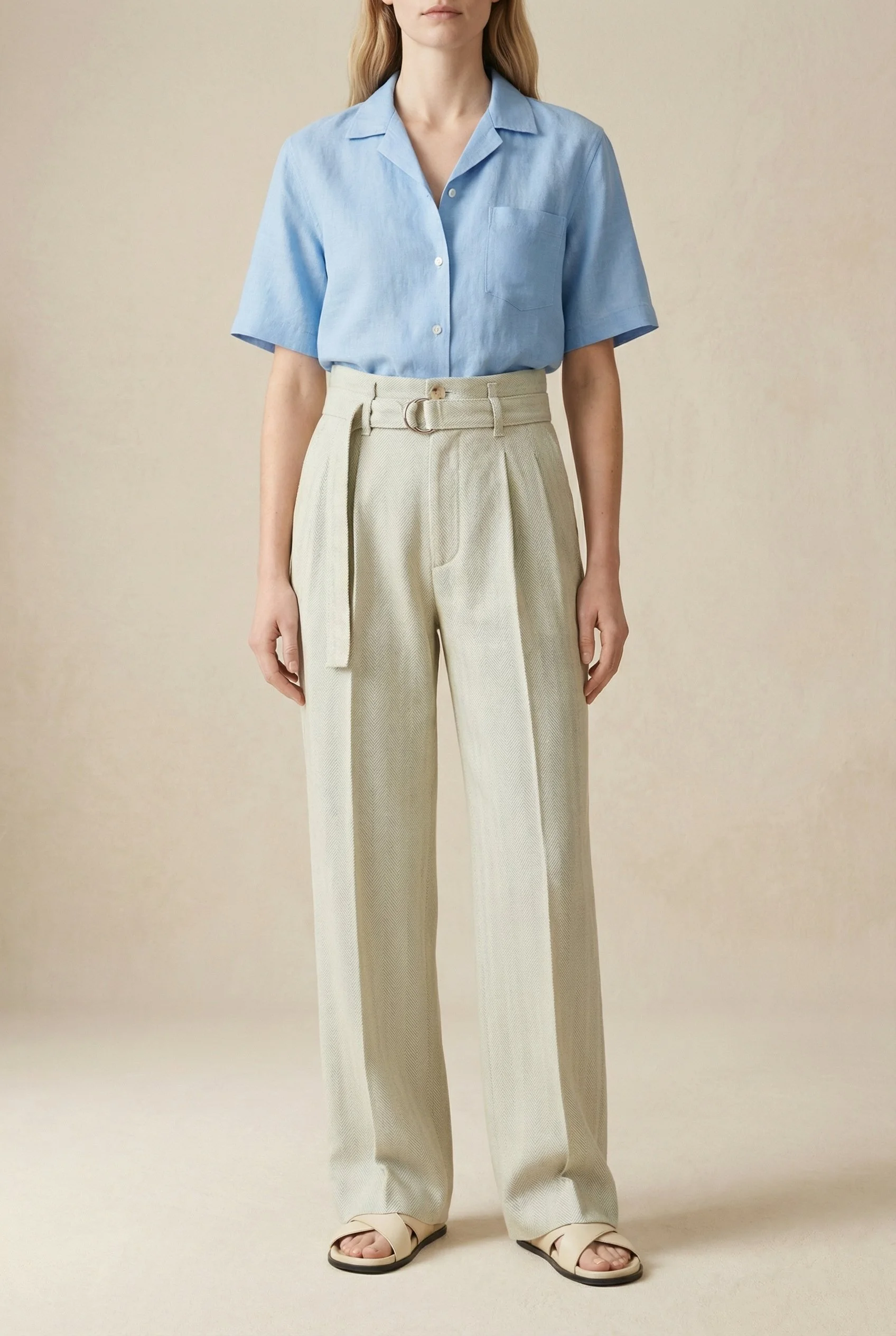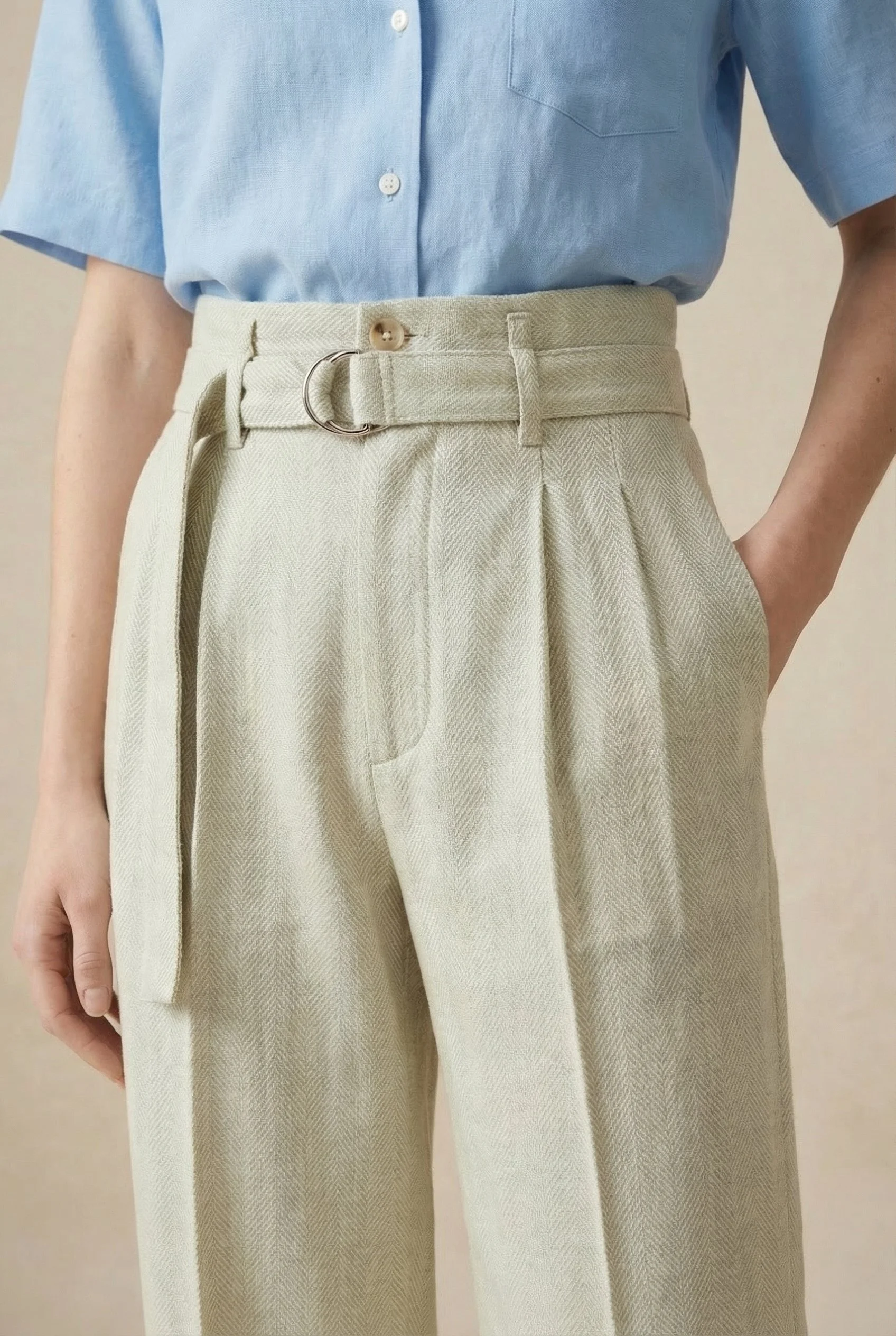 Pantalon ceinturé en coton et lin à chevrons, idéal pour le printemps et l’été. Ce pantalon a une coupe ample et est légèrement évasé sur le bas. Ce pantalon est doté d’une ceinture intégrée que vous pouvez retirer.