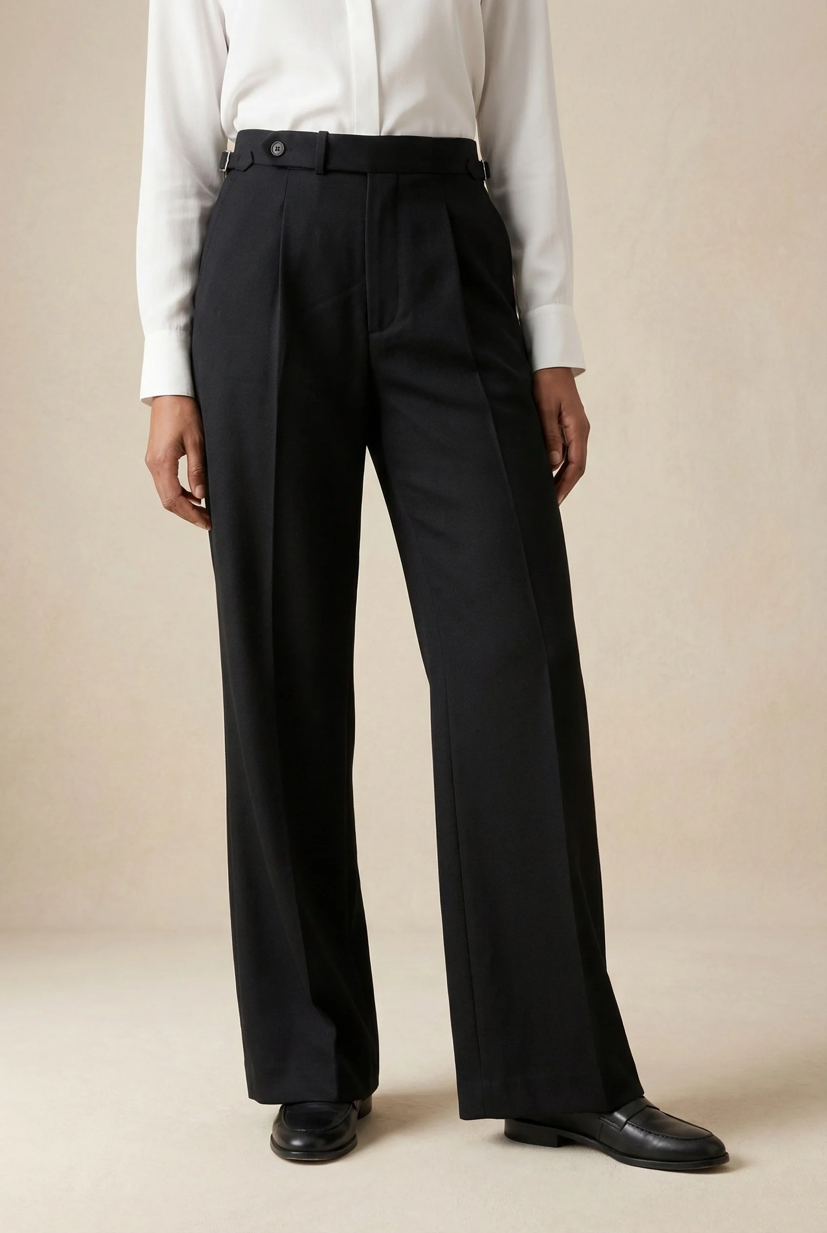 Pantalon à ajusteurs en laine épaisse noir, idéal pour l’automne, l’hiver et le printemps. Ce pantalon a une coupe ample et est légèrement évasé sur le bas. Il s’agit d’un tissu épais qui procure un beau tombé.