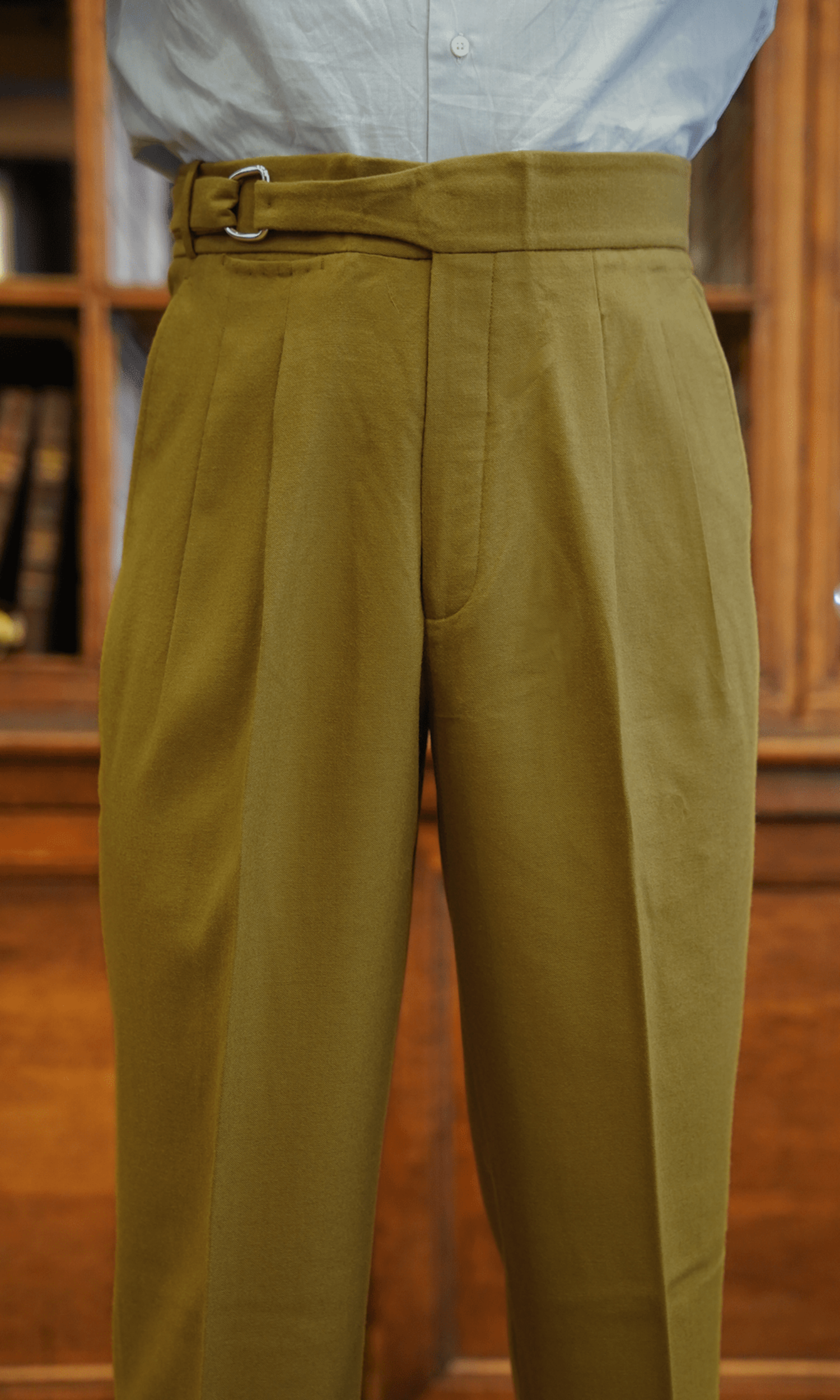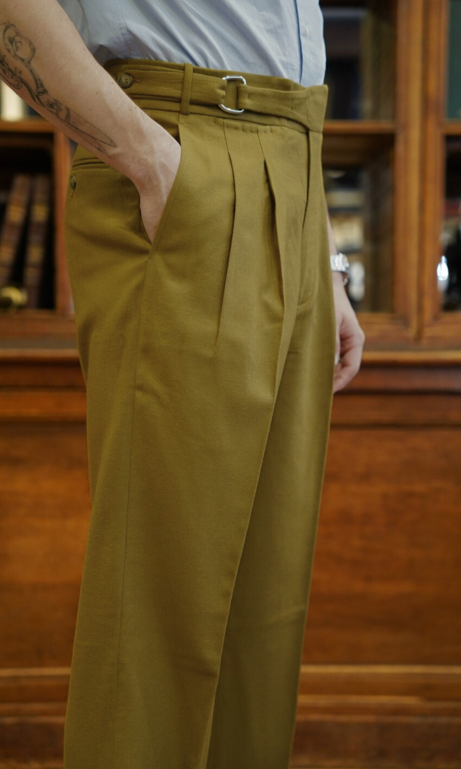 Pantalon D-RING en flanelle de laine vert bronze au poids moyen de 330g. Une laine à porter en automne, en hiver au printemps.